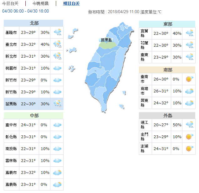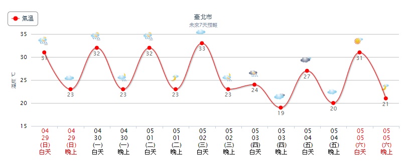 中央氣象局指出,明天一直到下周三(30日到5月2日)都會是與今天(29日)類似的天氣型態,全台天氣晴朗溫暖,除了東半部地區仍然不定時有局部短暫陣雨,其餘各地仍是上午較為穩定、陽光也會露臉,但下午注意午後雷陣雨的天氣型態,午後北部、中南部山區有局部短暫雷陣雨,並有局部大雨發生的機率。溫度方面,將會一天比一天熱,高溫普遍可來到30度左右,東半部地區則是27度左右,到了周三西半部高溫甚至將可來到34、35度,有機會再度刷新上周日台北34.1度今年最高溫的紀錄。