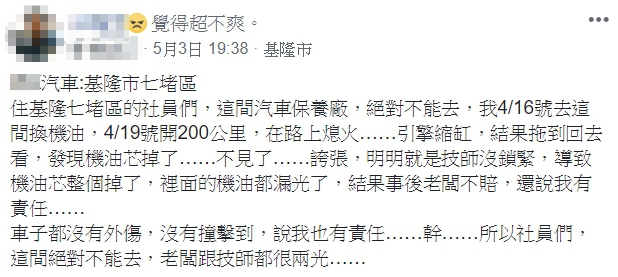 《爆料公社》PO文表示,上(4)月16日他到基隆某保養廠換機油,不料換完機油後還開不到200公里,19號當天他行駛在高速公路,機油燈突然亮起,他趕緊下交流道,結果沒多久引擎就在路上縮缸,導致汽車熄火,「結果拖到回去看,發現機油芯掉了…不見了…誇張」。