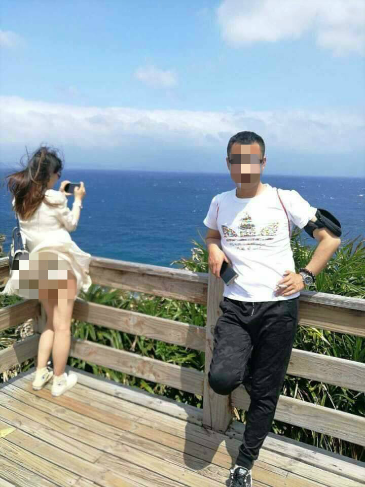 照片中只見一男一女分別和身後碧海藍天的遼闊海景合照,但仔細一看,2人的身旁皆出現了一名穿著白色洋裝的年輕女子,只見她拿著手機開心地自拍,不料吹起一陣海風將她的裙擺吹起,裙底風光瞬間春光外洩,露出了白色底褲,完全轉移了所有人的目光焦點,也讓網友全笑翻。
