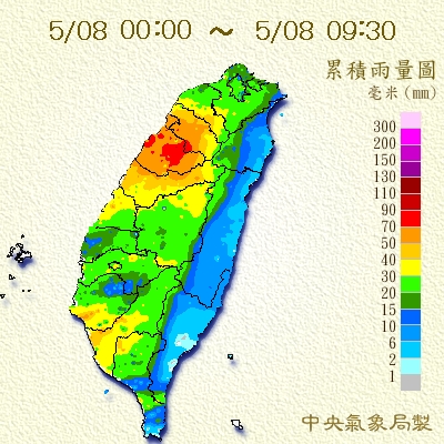 中央氣象局今(8)日凌晨3點發佈新竹縣市、苗栗縣、台中市、彰化縣、南投縣、雲林縣、嘉義縣市、台南市等10縣市的豪雨特報,以及雙北市、桃園市、基隆市、宜蘭縣及高雄市、屏東縣、澎湖縣等8縣市則發佈大雨特報。