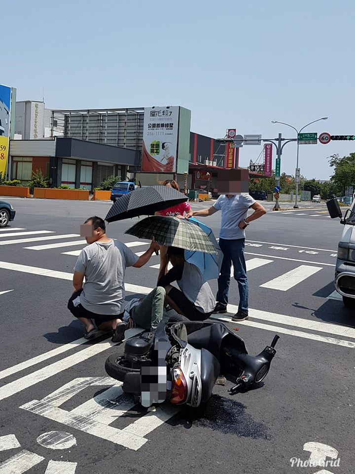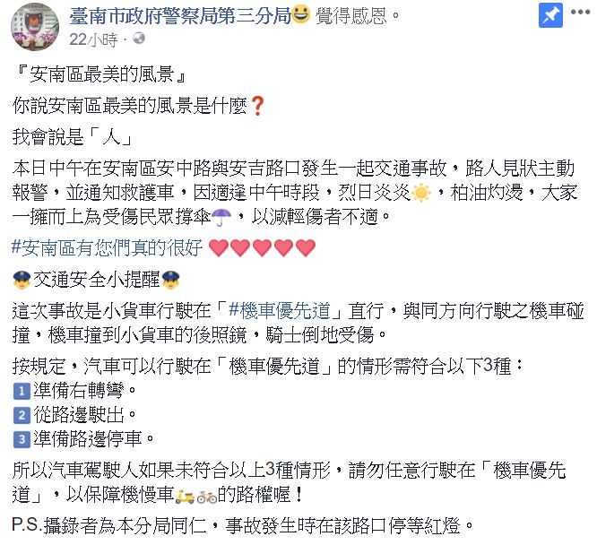 台南市政府警察局第三分局昨(4)在臉書發文,指出中午在安南區安中路與安吉路口,發生一起交通事故,一台小貨車行駛在「機車優先道」,與同方向行駛的機車發生碰撞,機車撞到小貨車的後照鏡,騎士倒地受傷,貼文中提到,當時路人見狀主動報警,並通知救護車,不過當時因為烈日當頭,該路段又沒有遮蔽物,有4名的路人聚集到受傷騎士身旁,撐著3把傘幫忙遮陽,以減輕傷者不適,也幫忙注意路上狀況,貼心舉動讓人看了好窩心。