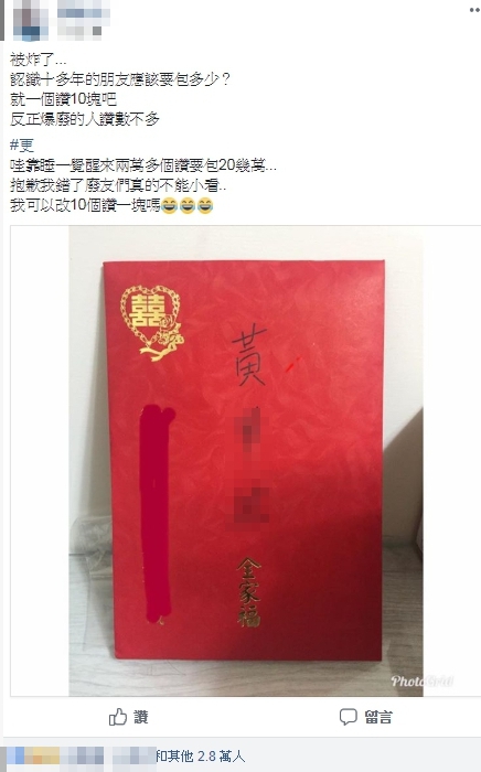 臉書社團「爆廢公社」中發文,秀出紅色炸彈的照片,並說:「被炸了…認識10多年的朋友應該要包多少?」之後還自訂遊戲規則「1個讚10塊」,要依照網友的按讚數量決定紅包金額,更嗆聲「反正爆廢的人讚數不多」不過他這個舉動儼然就是在挑釁網友,沒想到只過了半天左右的時間,就讓這篇貼文累積超過2.8萬個讚,更讓人見識到網友的實力。