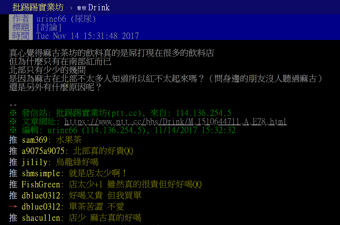 ▼網友不懂飲料店「麻古茶坊」在北部紅不起來,引發網友熱議。(圖/翻攝PTT)