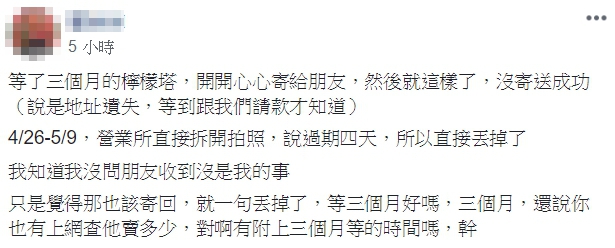 「那也該寄回,就一句丟掉了?」檸檬塔被丟掉,物流公司卻在事後才通知她,讓原PO十分憤怒,認為對方處理程序有瑕疵,而且3個月的等待時間,不是能用金錢賠償就可以彌補的,「就一句丟掉了,等3個月好嗎,3個月,還說你也有上網查他賣多少,對啊,有附上3個月等的時間嗎?X」。