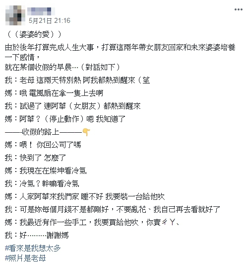 結果就在原PO快到公司的路上,突然接到媽媽打來的電話,一問之下才知道,平常超省的媽媽竟然在賣場看冷氣,「人家阿華(原PO女友)來我們家睡不好,我要裝一台給她吹」,原PO傻眼,「可是妳每個月錢不是都剛好,不要亂花,我自己再去看就好了」,結果只得到媽媽任性的回「我要買給她吹,你賣ㄔㄚ、」。