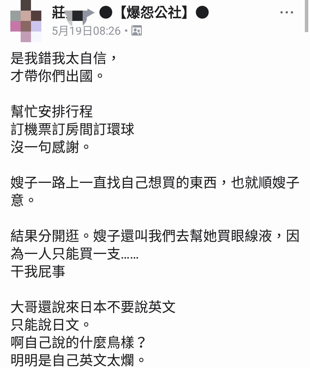 爆怨公社」發文,寫下「是我錯我太自信,才帶你們出國」,文中透露安排行程、訂機票房間都由自己一手包辦,但