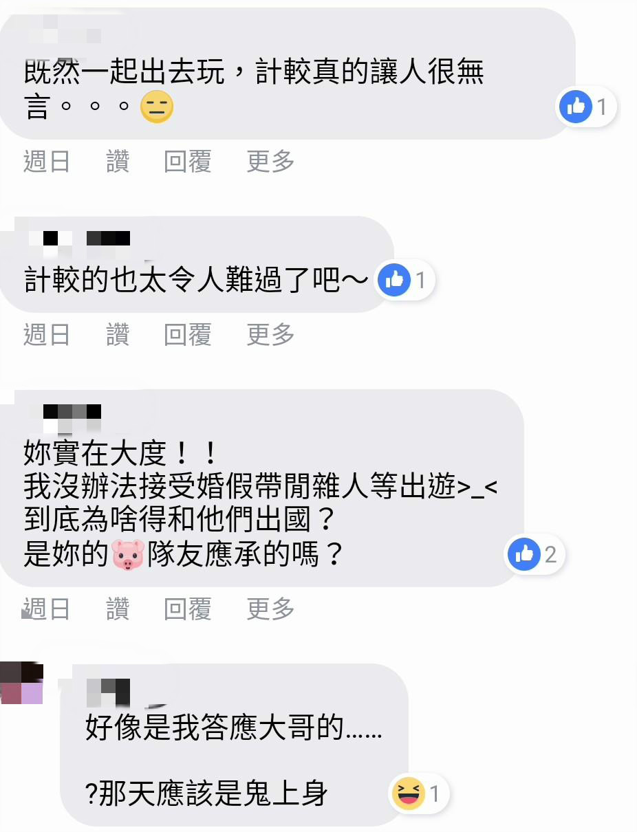 貼文一出,引起網友熱烈討論,「太靠北了…蜜月旅行湊什麼熱鬧啊」、「婚姻才剛開始,毒菇跟老姑婆就要發威了嗎?蜜月自己出錢是有事嗎?」、「讓他們自己去吧,把蜜月錢留著吃好料,妹妹沒錢還要跟,會不會臉皮太厚了點」、「既然都是一家人,為什麼他不幫你妹出?要你妹自己出?傻眼」。