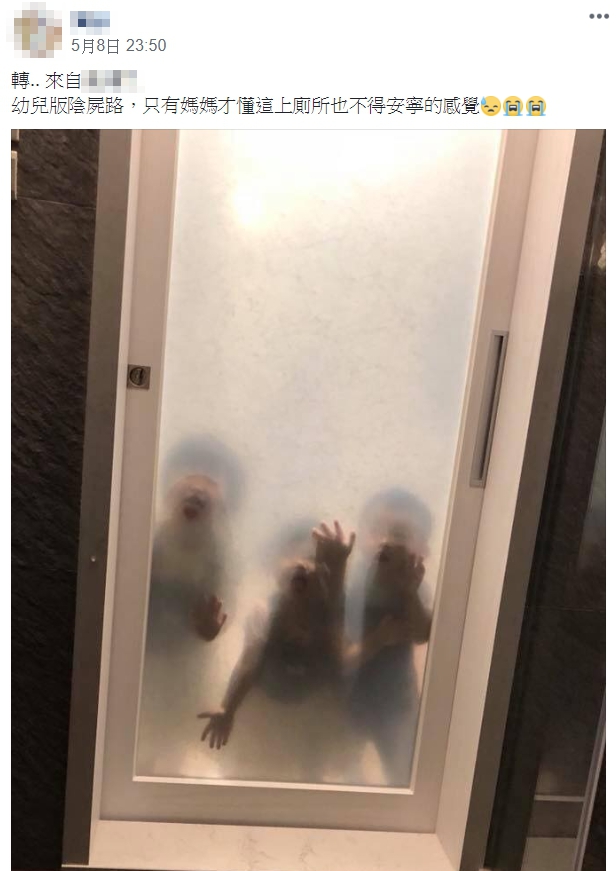 《爆廢公社》轉貼照片,只見3個孩子站在廁所外,將臉及手貼在半透明的玻璃門上,感覺一心想破門而入,從廁所內透過玻璃門看孩子,加上陰影的陪襯,看起來十分驚悚,讓原PO忍不住笑說「幼兒版陰屍路,只有媽媽才懂,上廁所也不得安寧的感覺」。