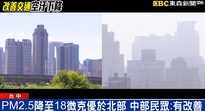 台中市過去3週PM2.5平均值降至18微克,已經優於北部許多縣市,市府主要針對移動汙染源管制,另外工業的燃油鍋爐改用天然氣,並且新增電動公車等等,26號下午測得台中16個空品測站都顯示綠燈,