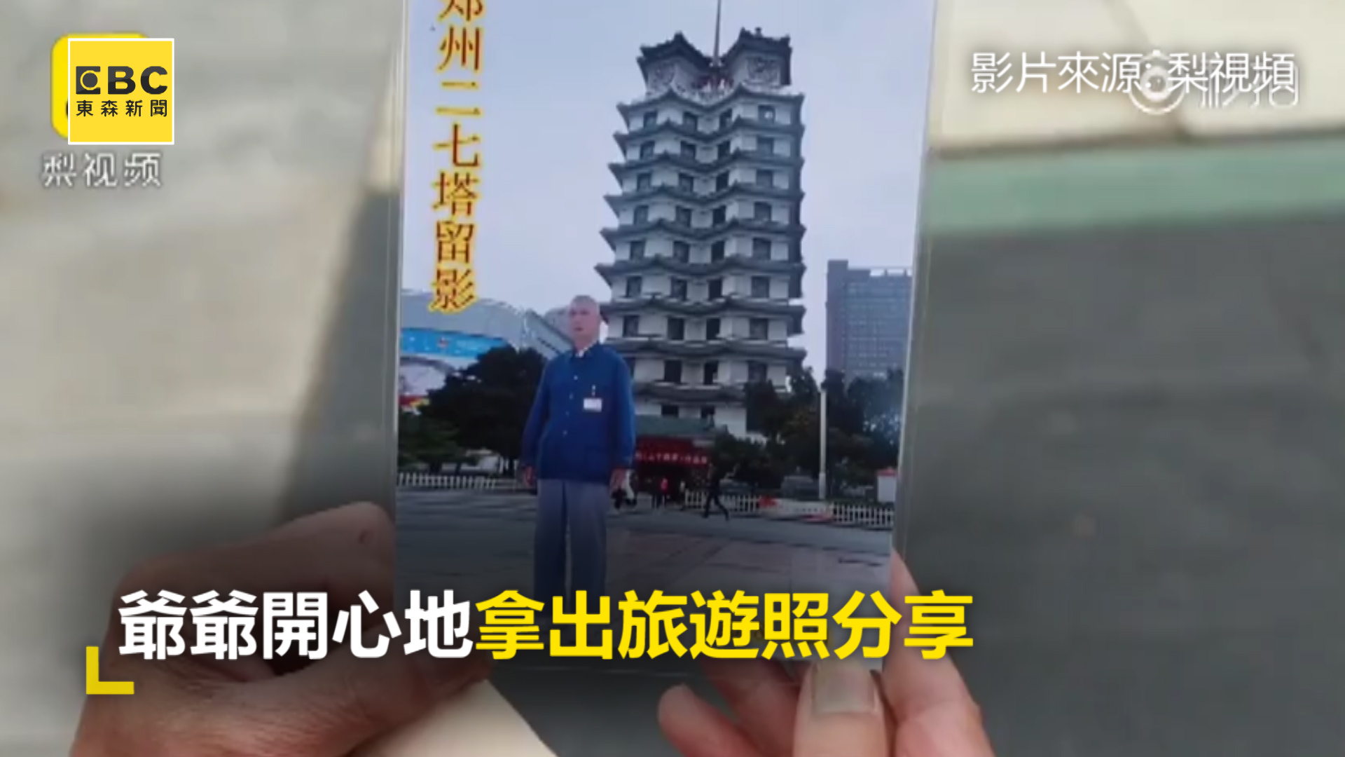 ▲爺爺首次到鄭州登上二七紀念館,還在館外開心拍了紀念照(圖/翻攝自梨視頻)
