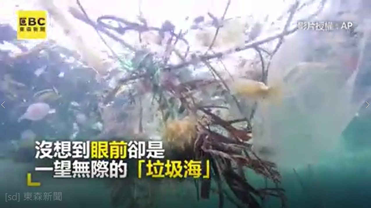 垃圾海,幾乎看不見魚群的蹤影,畫面中的垃圾除了樹枝之外,還包含了大量的塑膠類製品,變成可怕的「海洋怪獸」包圍著潛水員。