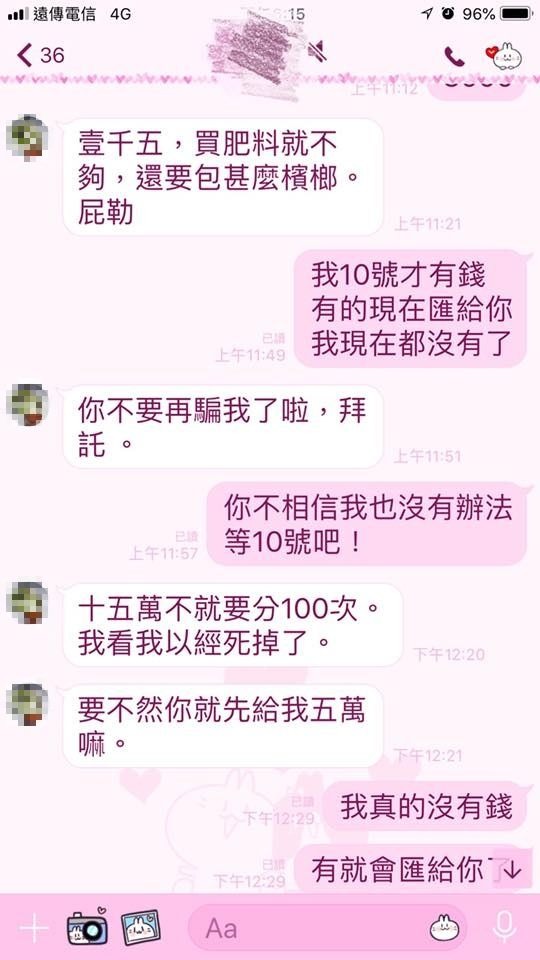 從對話內容中可以看見,原PO母親似乎想先還1500元,但舅舅卻說「1500,買肥料就不夠」,原PO媽媽回答她現在沒有錢,舅舅卻要她別再騙了,「15萬不就要分100次(還),我看我已經死掉了,不然妳先給我5萬嘛」。