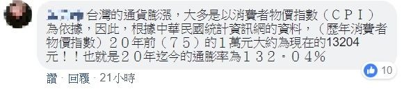 另外有網友犀利分析,「台灣的通貨膨漲,大多是以消費者物價指數(CPI)為依據,因此,根據中華民國統計資訊網的資料,(歷年消費者物價指數)20年前(75年)的1萬元大約為現在的1萬3204元!!也就是20年迄今的通膨率為132.04%」、「用公式算給他看,20年前定存利率約5%,更別說現在1%多,假設20年利率5%不變,也不過2.6~2.7倍」,認為原PO媽媽根本不用還那麼多。