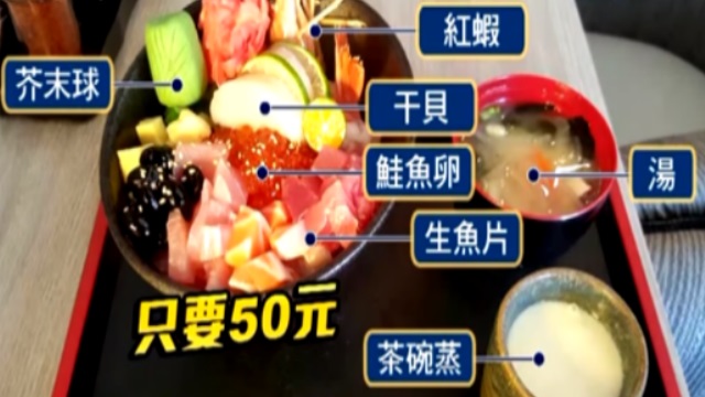 挖起一匙白飯放進碗裡,加上醬汁擺上小黃瓜,生魚片、鮭魚卵還有紅蝦,但這麼大份量的海鮮蓋飯居然只要銅板價。顧客:「太便宜了,就是物超所值。」花蓮一家日本料理店為了回饋消費者,除了周六以外,推出價值兩百多元的生魚片蓋飯只要50元,看看裡頭吃的到新鮮的旗魚、鮪魚,切丁生魚片搭配甜甜紅蝦、干貝、鮭魚卵,最後再放顆芥末球,隨餐附贈茶碗蒸和味噌湯完全不怕吃不飽。