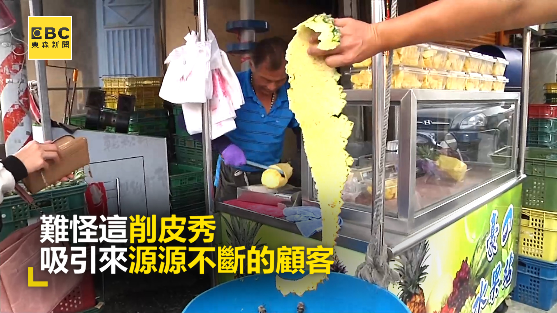 看到這場削皮秀,顧客大讚真的是秒殺!而吳老闆說削皮技術這麼純熟,除了不斷的練習外,當然少不了手上的秘密武器,削好的鳳梨直接切塊,手完全不碰到它,不止美觀還衛生得多了,也難怪這削皮秀,吸引來源源不斷的顧客。