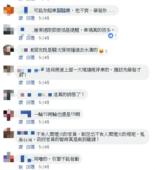 超速了」、「阿婆騎電動車都超過時速」、「直排輪都可能超速」、「下來走路,還比較快」、「還好腳踏車沒掛車號」。