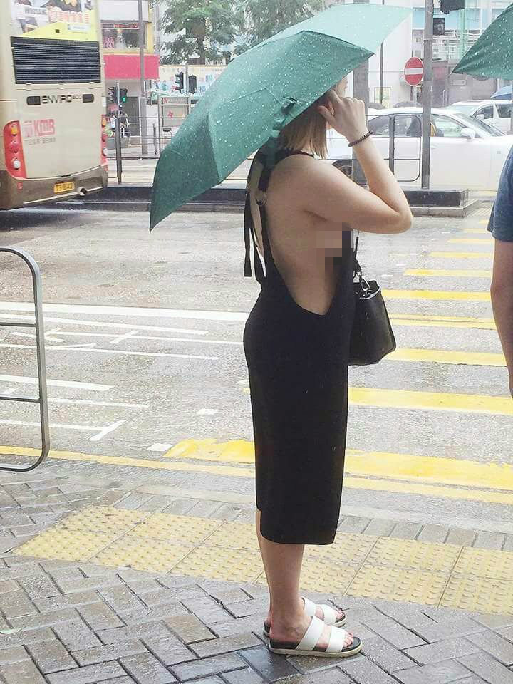 該名男網友在臉書「爆廢公社」曬出這張照片,只見畫面中的金髮妹穿著黑色洋裝,手拿陽傘站在路肩上等公車,但當目光再往下一看,貼身的設計讓誘人臀型不僅若隱若現,同時更大方露出白皙嫩滑的美背。此外,正當她右手微抬的一瞬間,渾圓「
