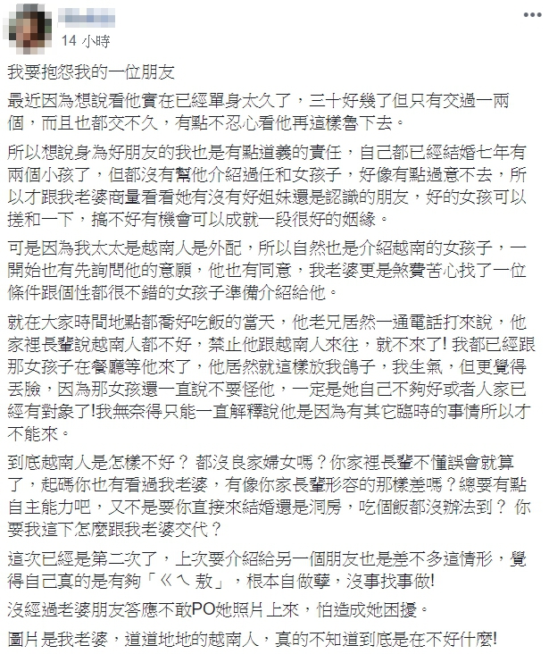 不料相約吃飯當天,朋友卻打電話給原PO表示要取消約會,理由是「家裡長輩說越南人都不好,禁止他跟越南人來往」,這一番話讓原PO氣炸,沒想到被放鴿子的越南女孩子完全不生氣,還安撫原PO「不要怪他,一定是自己不夠好,或者人家已經有對象了」,原PO不想傷女孩子的心,只好向她解釋,朋友是因為臨時有事才無法赴約。