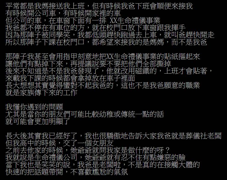 原PO高中時交了女朋友,不料到對方家拜訪時,一講出「家裡是開生命禮儀公司」,馬上遭受女友爺爺嫌棄,「當下我也是笑笑的說,我爸是老闆啦,不是真的在接觸大體的,快速的把話題帶開,不喜歡尷尬的氣氛」,原PO十分無奈,透露長大後也有跟幾個女生曖昧,但知道他的職業後都瞬間冷掉,「嘴巴上都會說