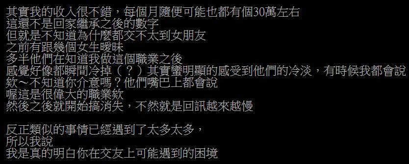 「現在心態上不會自卑了,純粹只是有點搞不懂,到底這個行業跟交女友有什麼關聯?」原PO在
