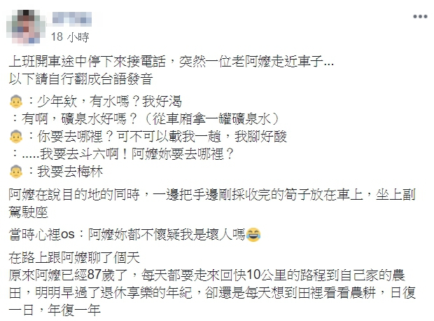 《爆廢公社》透露,日前在上班途中停下來接電話,突然有一位阿嬤走近車子,先是詢問能不能借口水喝,「少年欸,有水嗎?我好渴」,接著追問「你要去哪裡?可不可以載我一趟,我腳好酸」,原PO大方從車廂拿出一罐礦泉水交給阿嬤,並貼心問「我要去斗六啊!阿嬤妳要去哪裡?」阿嬤一邊表示自己要去梅林,一邊把剛採收完的筍子放在車上,並坐上副駕駛座,雖然原PO很樂意順路在阿嬤,但也不禁在內心疑惑「阿嬤,妳都不懷疑我是壞人嗎」。