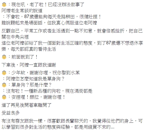 「喜歡跟長輩聊天的,我覺得從他們的身上,可以學習到很多對生活的態度與經驗,都是用錢買不來的…」阿嬤下車後,原PO一個人繼續開車,不禁開始反思,自己平常在工作或者生活遇到一點不如意,就會倍感挫折,阿嬤卻給了他一個面對生活正確的態度,到了87歲還不想退休享樂,每天都認真的看待生活,讓他受到激勵。