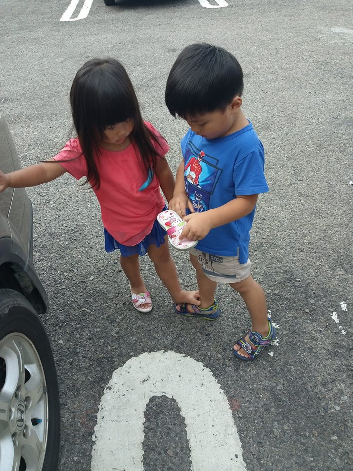 一名網友在臉書「爆廢公社」貼出照片,畫面中一個穿著藍色T-shirt的小男孩拿著一隻粉紅色拖鞋,仔細地低頭檢視,往下一看,他的小腳竟被一旁的小妹妹赤腳踩著,妹妹一手扶著一旁汽車,也低頭看著拖鞋。