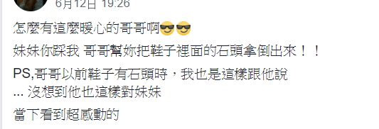 鞋子裡似乎有石頭,哥哥就霸氣地說「妹妹妳踩我,哥哥幫妳把鞋子裡面的石頭倒出來!」才因此有這溫馨的畫面。PO文的媽媽說道,以前兒子鞋子裡有石頭時,她也叫兒子踩著她的腳,想不到兒子如法炮製,也貼心地幫助妹妹,讓媽媽不禁直呼「當下看到超感動的!」