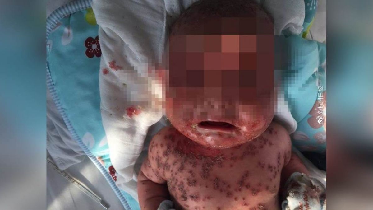 從曝光照片可以看到,女嬰全身長滿一粒粒疱疹,白色的毛巾上沾滿鮮血,孩子痛苦哭號,原本白皙稚嫩的皮膚變得破爛不堪。好在經過1個月的治療,女嬰恢復狀況良好,身上的皮膚漸漸脫落長出新的,也不會造成疤痕。