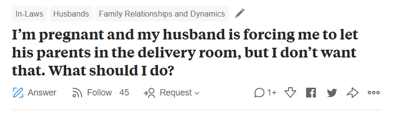 一名女網友在Quora論壇上用英文詢問此事,有網友看到她的煩惱後,回應如雪片般飛來,「我不得不說,我真的很驚訝!他們居然會有這個想法,真的太不正常了。直接說不就好,你的身體你做主,你不需要解釋,一個字,不。」「生孩子,你以為看電影啊?」「妳的產房不是馬戲團!」