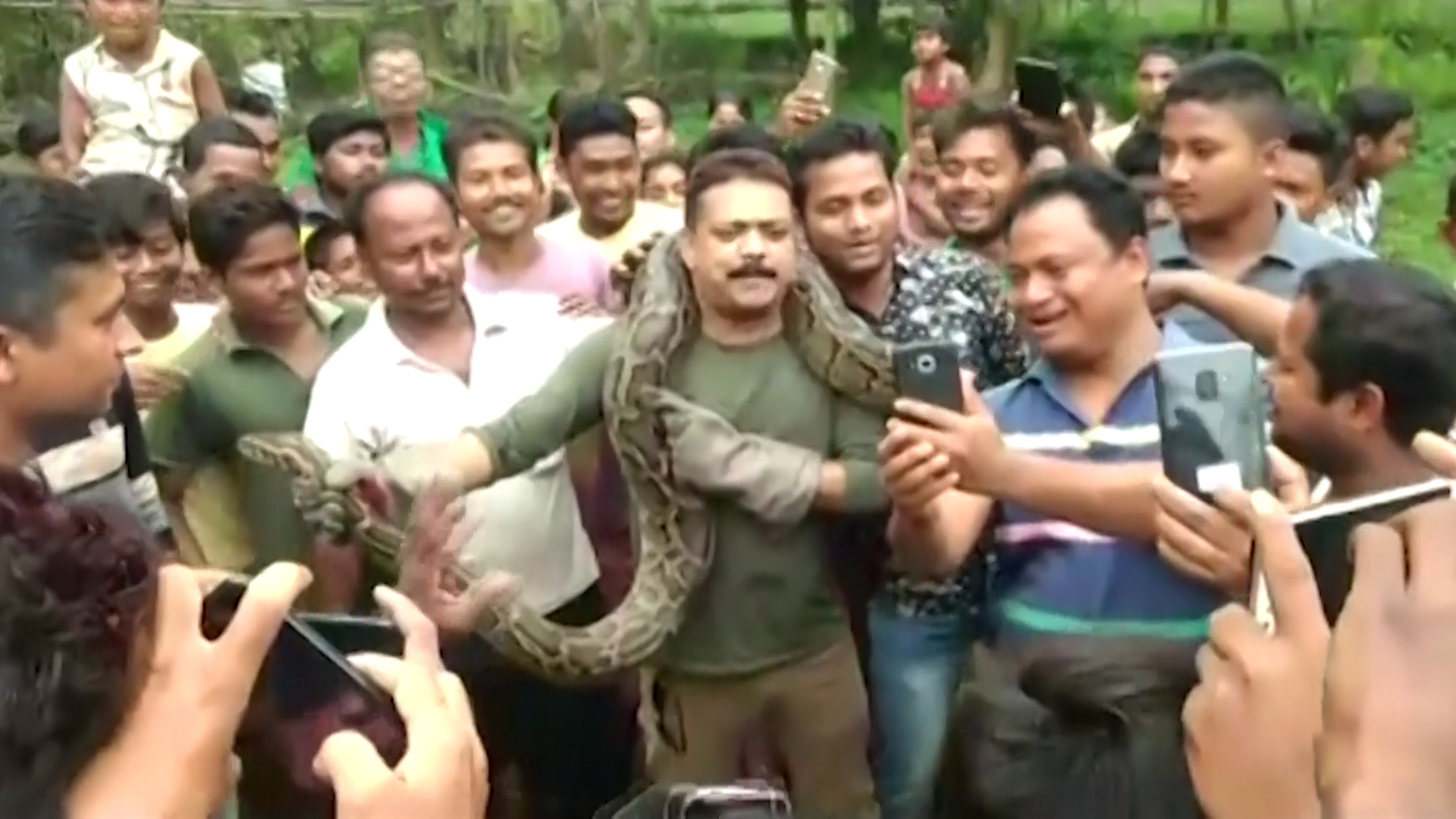 印度西孟加拉邦(West Bengal)一名森林警察杜塔(Sanjay Dutta),6月17日時從Baikunthapur森林中,抓到了一條長達10公尺、重40公斤的印度蟒,當時牠還在吃一隻山羊。許多民眾都覺得稀奇而前來圍觀,也許是為了炫耀,他並沒有把