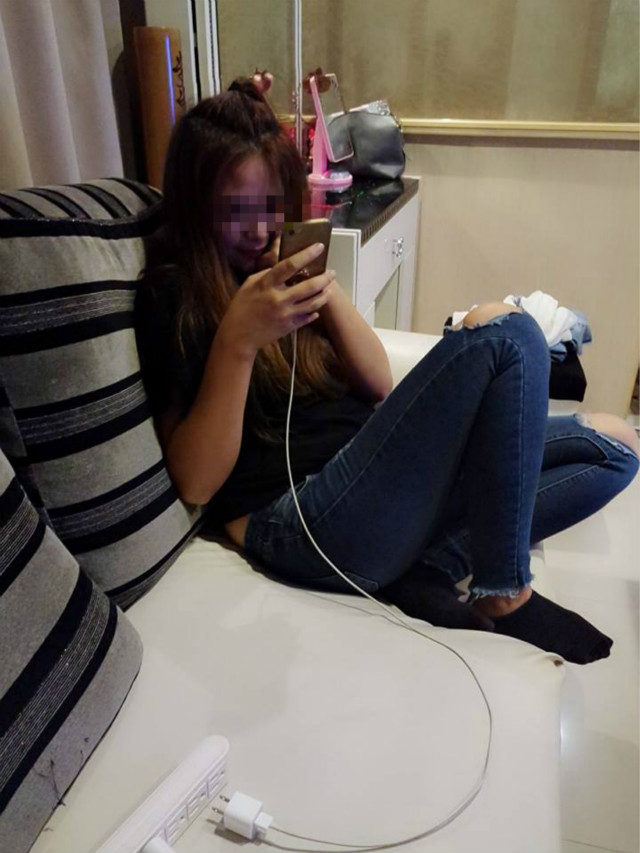 正妹姐姐,坐在沙發上認真玩手機,下方特地連接