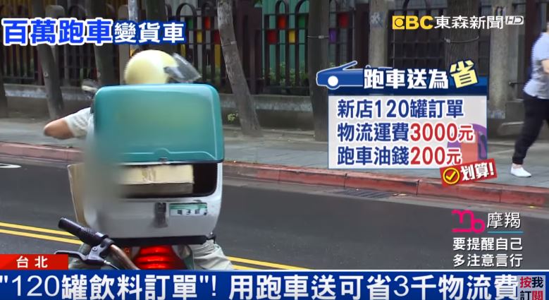 原來當天飲料店接到大筆訂單,新店區某客戶訂了120罐,如果用物流送飲料運費要3000元,用跑車送油錢頂多200元上下,不過難免樹大招風。