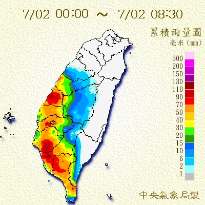 氣象局觀測,凌晨開始中南部地區出現明顯的雨勢,局部地區有大雨,0時至上午6時40分,高雄燕巢、彰化鹽埔累積雨量都超過100毫米,台南仁德、台南歸仁、高雄岡山、彰化大村也有90多毫米。