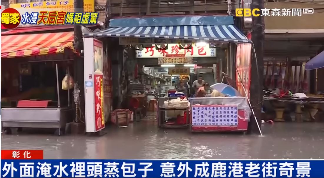 大雨來得又急又快,半小時內就淹起水來,鹿港老街的商家從沒遇過這種情況,所以都習慣把東西放在地上,才會來不及收拾。鹿港老街淹得慘,商家幾乎都沒開,忙著善後。對比天后宮,隔了一天,雖然大雨還在持續下,但現在已經沒有淹水了,隔壁店家也開始照常營業。鹿港老街蚵仔煎老闆娘:「水退了就開始營業了,昨天淹得很嚴重,都沒辦法營業,從來不曾淹水淹得這麼高。」