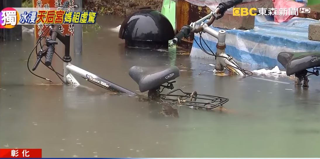 中台灣的雨勢來的又快又急,鹿港地區的新祖宮,短短半個小時雨水就淹到小腿肚,連廟門檻也差點被淹過,還有一輛轎車停在門口也來不及開走,水淹一個輪胎高,即使雨勢暫緩也是泡在水裡,民眾形容這雨比颱風誇張,跑都來不及跑。