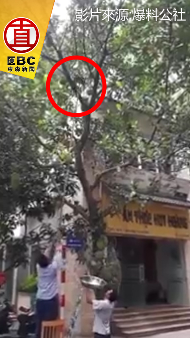 波羅蜜」,一旁的友人踩上椅子拿著長竹竿,不斷戳呀戳,下一秒悲劇卻發生了,重力加速度下,波羅蜜掉進鐵盆,重重地往男子的頭部砸,並發出極大聲響,而那一刻讓不少網友笑翻了。