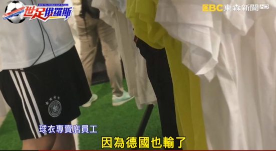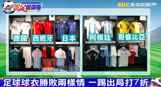 球衣,彈性也不錯。不過球賽還沒打完,怎麼已經開始打折。球衣專賣店員工:「因為德國也輸了這兩個也打7折(沒有打折的話)因為沒輸掉。」