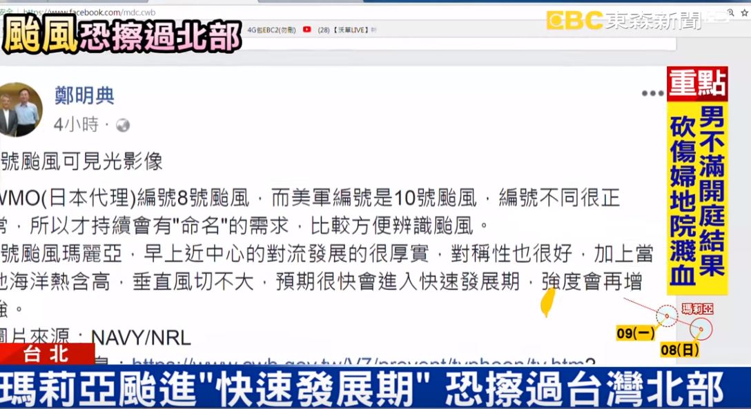 今年第8號颱風,已經長出來,名叫瑪莉亞颱風。鄭明典在臉書發文表示,颱風中心的對流發展好,颱風中心的對流發展好,加上當地海溫高,強度會再增強。