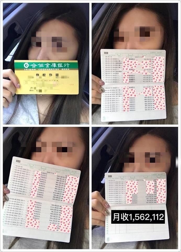 正妹車主不僅用自身經歷鼓勵他人,更透露自己賺錢的方式,「光是手上其中一個案子跟建商配合一個月,就突破月收入156萬,這種資訊發達的時代,如果手上只擁有單一管道的賺錢方式就太慢了」,並附上存款簿的照片。