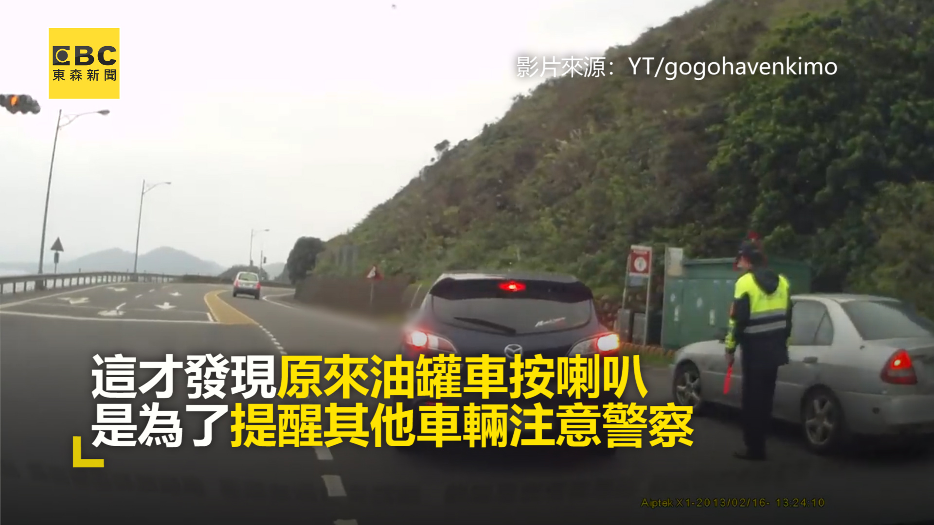 警察攔下,這才發現原來油罐車按喇叭,是為了提醒其他車輛注意警察。