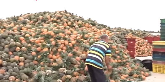 火龍果一顆5元,果粒小了點、賣相還不差,這是在台南市的青果市場,不只火龍果便宜,芭樂一大袋也才60元,挑水果的民眾可開心了。消費者買到便宜好吃的水果,卻苦了果農,先來看看嘉義的鳳梨,雖然產季已經接近尾聲,但行口的鳳梨卻堆成一座座小山。