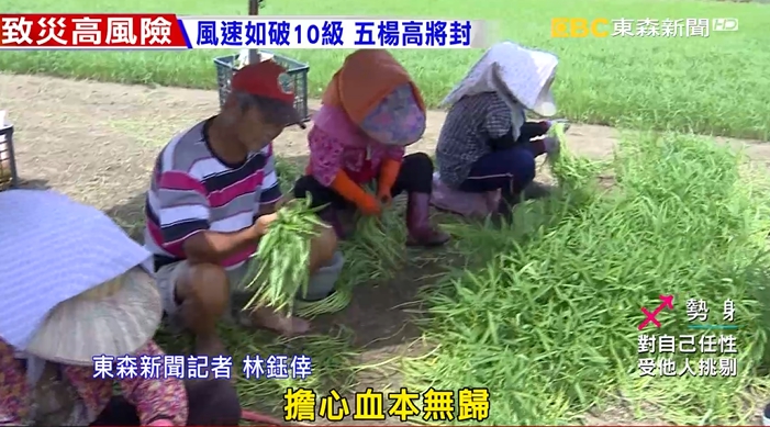 東森新聞記者林鈺倖:「受到瑪莉亞颱風的影響,梓官這邊的菜農,擔心血本無歸,趕緊趁著颱風來之前,趕緊來搶收空心菜。」