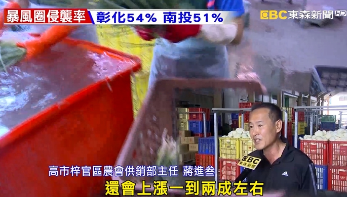 高市梓官區農會供銷部主任蔣進叁:「如果消費者明天、後天,就遇到颱風預期要來的時候,可能消費者會搶,那搶的時候,可能會讓這個價格,還會上漲一到兩成左右。」