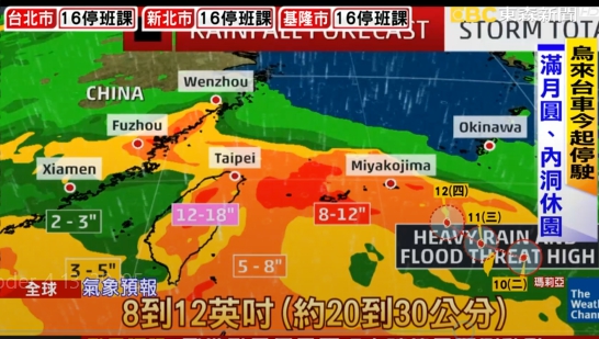 氣象預報:「最大擔憂是風但還有雨,當颱風接近時北台灣像是台北會刮起強風外,還會下起大雨8到12英吋(約20到30公分),有些地區甚至高達45公分
