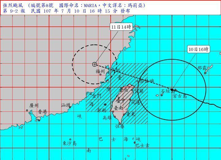 颱風持續往西前進,預估先島群島仍會颳著猛烈的風,預估到明天為止,最大風速每秒50公尺、瞬間最大風速每秒70公尺。日本「讀賣新聞」報導,颱風瑪莉亞在沖繩縣先島群島周邊往西前進,預估明天登陸中國大陸。