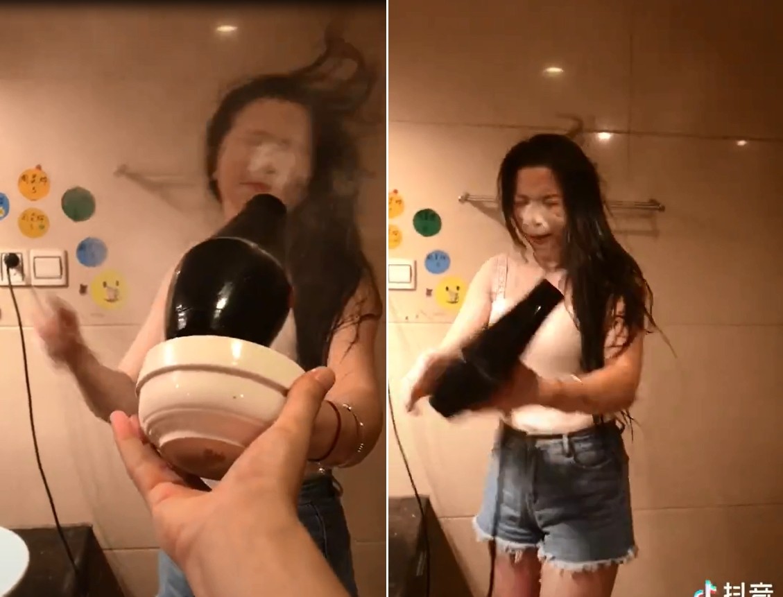 影片中能看到,女友正吹著溼答答的頭髮,沒想到男友卻拿著一碗麵粉,放到吹風機的後方,裡頭的白色粉末立刻撲到女友臉上,讓女友瞬間氣炸,頭髮都不吹了,直接沿路追著男友打,其實影片看似歡樂卻暗藏危機,因為麵粉遇到高溫很容易引起粉