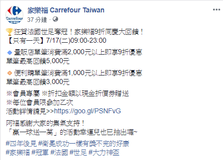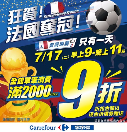為了慶祝法國勇奪世界盃足球賽冠居,家樂福明(17)日推出全台分店購物滿2千元,便可享有打9折回饋。凡是家樂福會員在此時段單筆消費滿2千元,就可以回饋10%現金折價券,單筆最高回饋5千元;便利購分店則是滿千元就可打9折,且即日起至7月20日前使用聯名卡購買家樂福自有品牌商品滿399元,可享有8折優惠。同時,便利購分店則是滿1千元就可享9折回饋,單筆最高回饋3千元,現金折價券可於7月18日至7月24日內進行消費折抵。