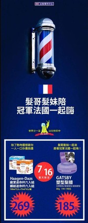法國隊終場4比2擊敗克羅埃西亞,睽違20年再度光榮奪下冠軍寶座。不少來自法商經營的商家紛紛祭出優惠活動,大型量販店