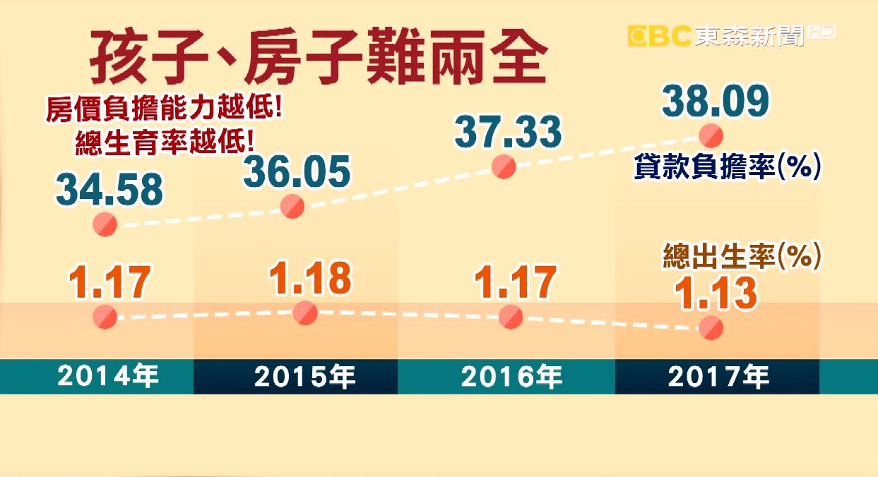 就盼補貼能讓租屋族喘口氣,只是觀察民眾買房能力的貸款負擔率卻逐年飆高,目前營建署公布,今年第1季的全國家庭平均貸款負擔率是35.35%,從2015年的36.5%到,飆到2017的38.09%,代表民眾扛的房債壓力變高,但對照總出生率卻是逐年下滑 。